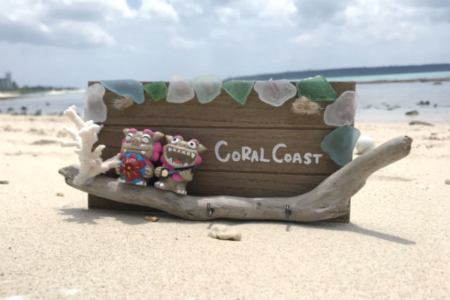 可愛らしい小さなシーサーの人形を使ってルームプレートを作る、ミニシーサークラフト!主役となるシーサーの配置、サンゴや流木・貝殻のバランスなど、センスの問われるクラフトワークです。(笑)